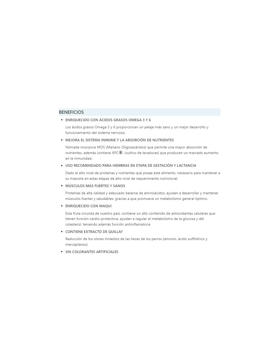 Nómade incorpora MOS (Manano Oligosacáridos) que permite una mayor absorción de nutrientes, además contiene XPC®, (cultivo de levaduras) que producen un marcado aumento en la inmunidad. |