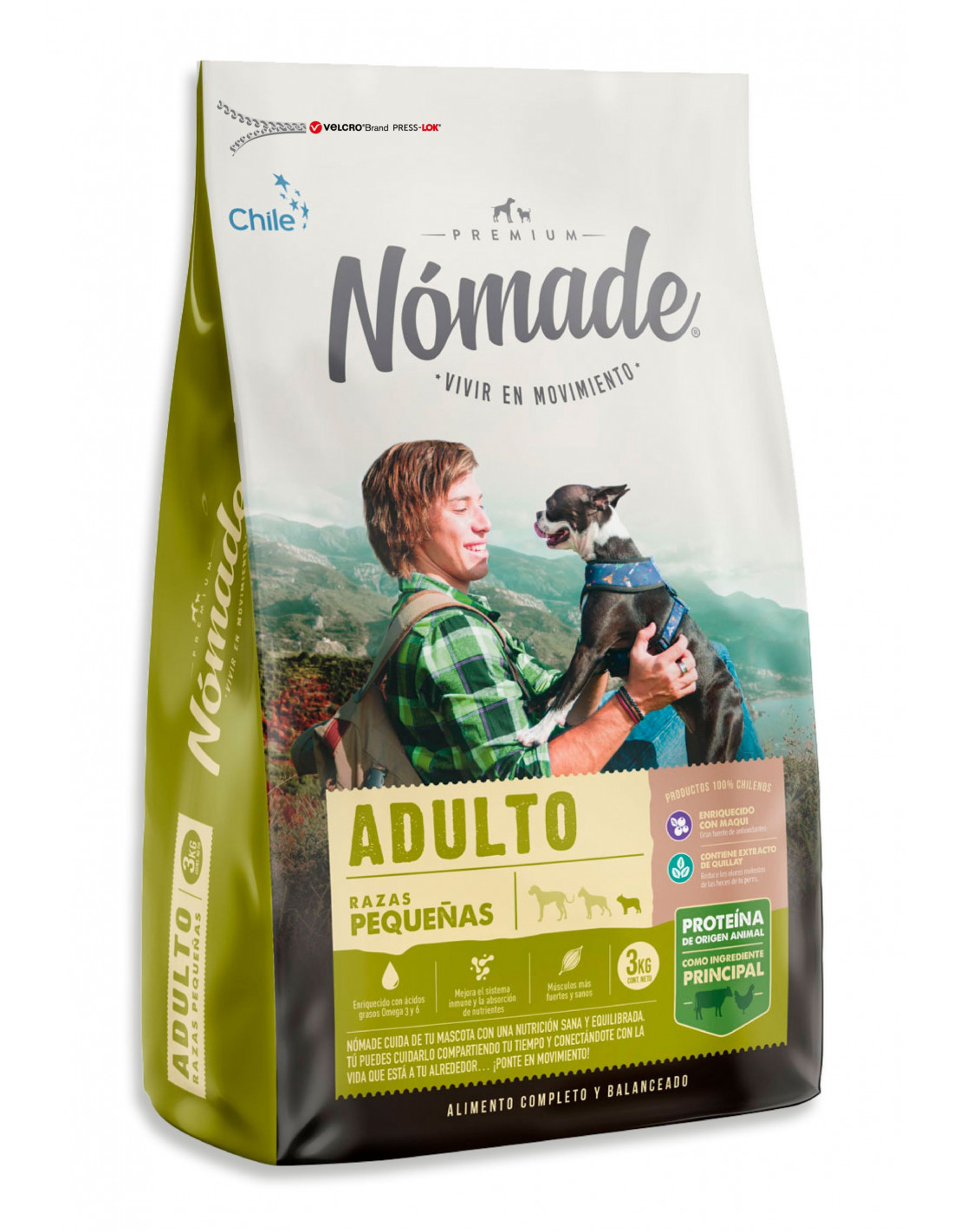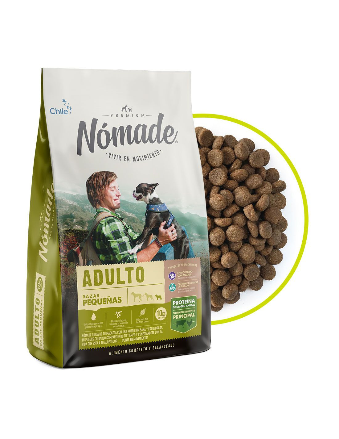 Nómade es un alimento para perros adultos de razas pequeñas desarrollado por expertos en nutrición animal, proporciona una dieta sana y equilibrada para una vida plena, feliz y en movimiento.