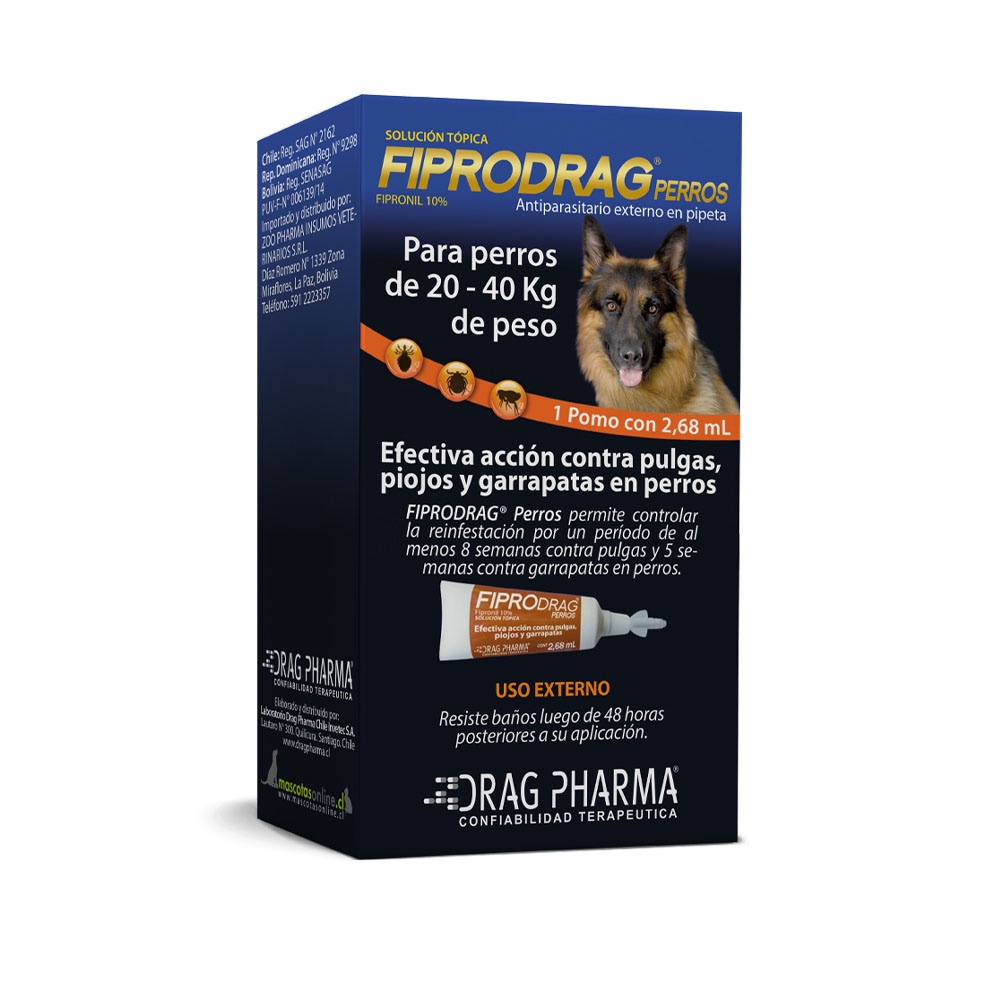 FIPRODRAG® Perros está indicado para el tratamiento y control de la infestación por pulgas (Ctenocephalides felis y Ctenocephalides canis), piojos (Trichodectes canis) y garrapatas (Rhipicephalus sanguineus) en perros. Su uso además se recomienda como terapia complementaria de la dermatitis alérgica por pulgas (DAPP) en perros.