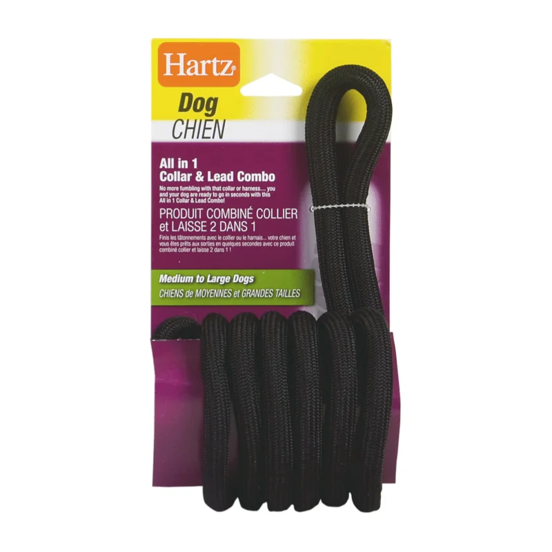 Hartz All in 1 Collar and Lead Combo combina un collar y una correa en una sola pieza flexible que se puede usar sobre un collar existente o solo.