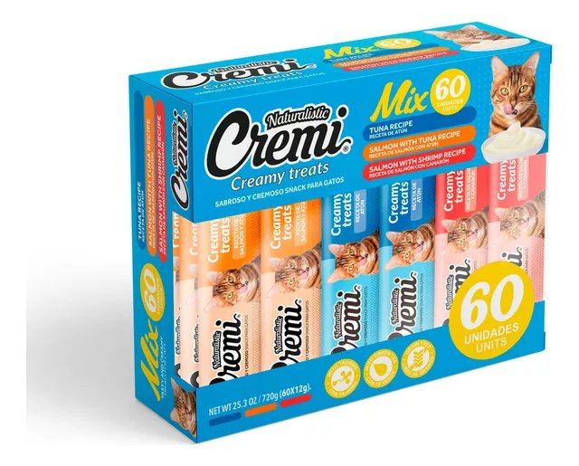 Naturalistic Cremi es un snack cremoso para gatos de todas las edades. Elaborado con carne de atún, salmón y camarón, y reforzado con taurina, un aminoácido esencial para los gatos. La fórmula también contiene extracto de té verde, conocido por su alto poder antioxidante. Este snack se puede alimentar a mano directamente del tubo, verter en un tazón, o usar como aderezo en alimentos húmedos o secos. Su alto porcentaje de humedad ayuda a promover la hidratación y aporta solo 6.9 kcal por tubo.